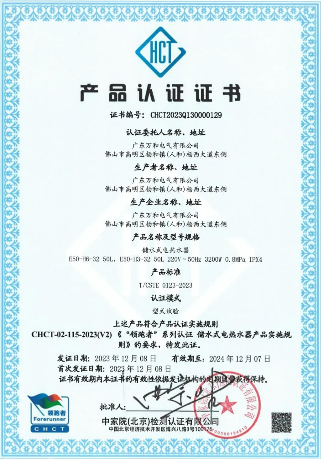 最近,中家院(北京)检测认证有限公司正式下发产品认证证书,认定由广东万和电气有限公司(广东万和新电气股份有限公司子公司)生产的两款电热水器E50-H6-32和E50-H3-32双双通过“领跑者”系列认证。
