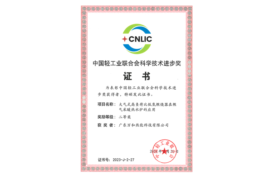 近日,中国轻工业联合会五届四次、中华全国手工业合作总社八届四次理事会在广元召开,会上公布了2023年度中国轻工业联合会科学技术获奖项目,由广东万和热能科技有限公司(万和电气子公司)研发的科技项目“大气式高负荷比低氮燃烧器在燃气采暖热水炉的应用”荣获中国轻工业联合会科学技术进步奖二等奖。