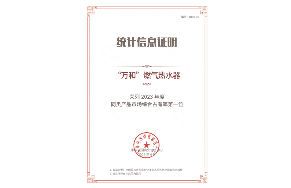 4月18日,由中国商业联合会、中华全国商业信息中心联合主办 “2024中国消费品市场发展大会暨第三十二届中国市场商品销售统计结果发布会”在北京中国职工之家召开,根据对全国大型零售企业商品销售调查统计结果,中华全国商业信息中心认定广东万和新电气股份有限公司旗下的“万和”燃气热水器荣列2023年度同类产品市场综合占有率第一位,这已是“万和”燃气热水器连续20年获得此项桂冠。