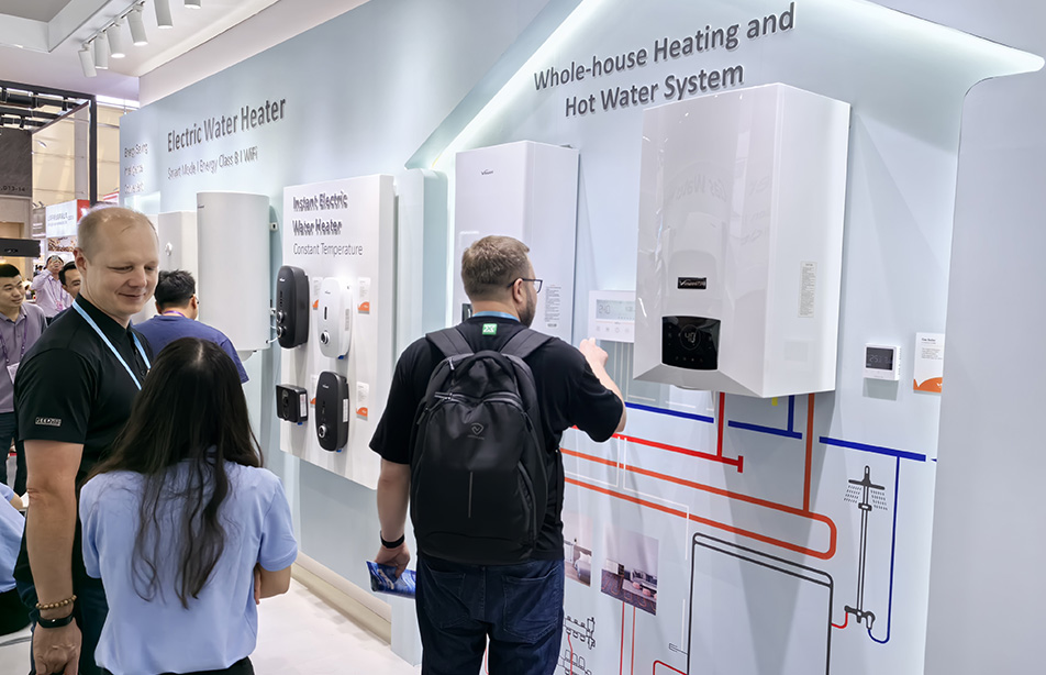 此外,万和还展示全屋供暖与热水并联系统,支持8台壁挂炉并联控制,满足多区域分区控制需求,六大模式满足多种场景下用户需求,并通过手机APP实现智能操控。这一系统特别针对欧洲等寒冷地区的市场需求,将成为万和开拓海外市场自主品牌的利剑。
