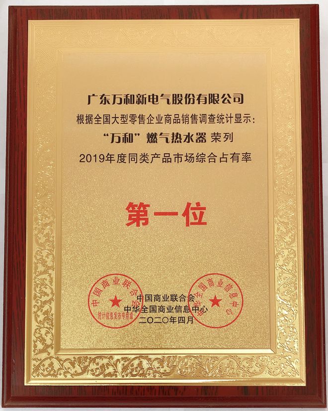 根据中国商业联合会、中华全国商业信息中心共同发布的2019中国市场商品销售数据,“万和”燃气热水器同类产品市场综合占有率继续蝉联第一位,万和在燃气热水器品类中连续十六年市场综合占有率第一,并进入工信部公布的“第三批制造业单项冠军培育企业”,“万和”燃气热水器被评为“2019年度中国消费品市场高质量发展优选品牌”。