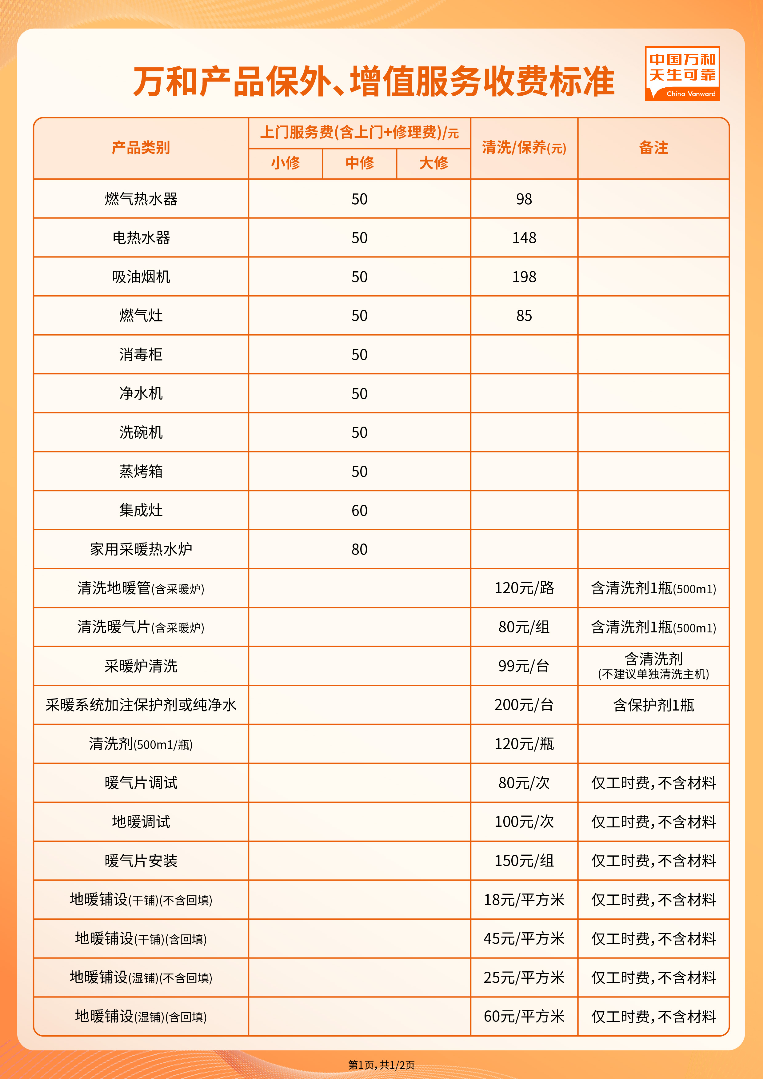 二、万和产品保外服务管理及收费标准