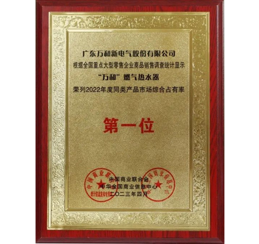 中国商业联合会、中华全国商业信息中心发布2022年度中国市场商品销售统计结果。根据全国大型零售企业商品销售调查统计显示,“万和”燃气热水器荣列2022年度同类产品市场综合占有率第一位,这是“万和”燃气热水器连续十九年获得此项桂冠。